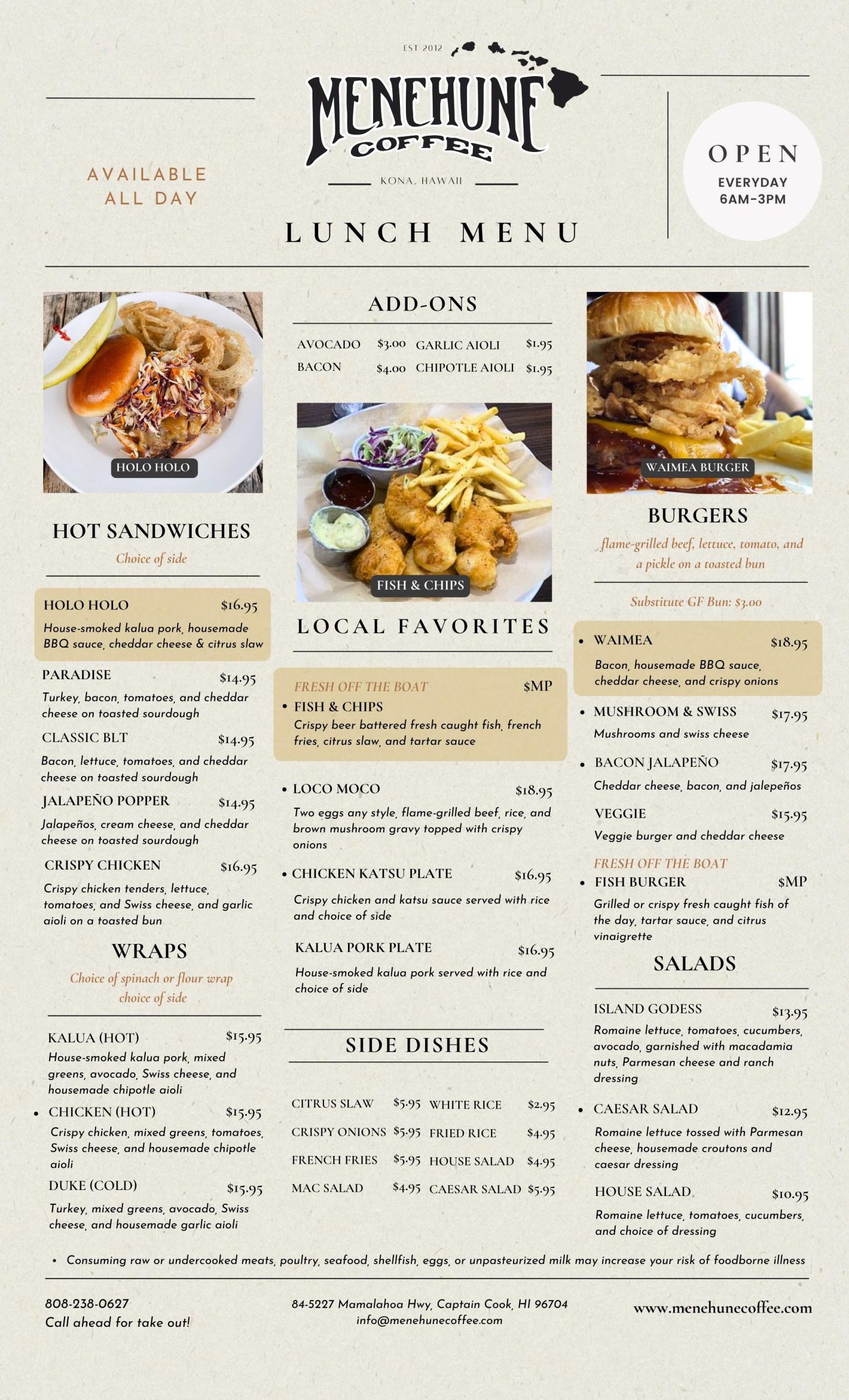 Menehune Coffee Cafe New Menu is out! New items on the menu Banana Haupia Waffles, Chicken Katsu and so much more! Open daily 6am-3pm 84-5227 Mamalahoa Hwy Captain Cook Hi 9704 Call ahead for takeout 808-238-0627